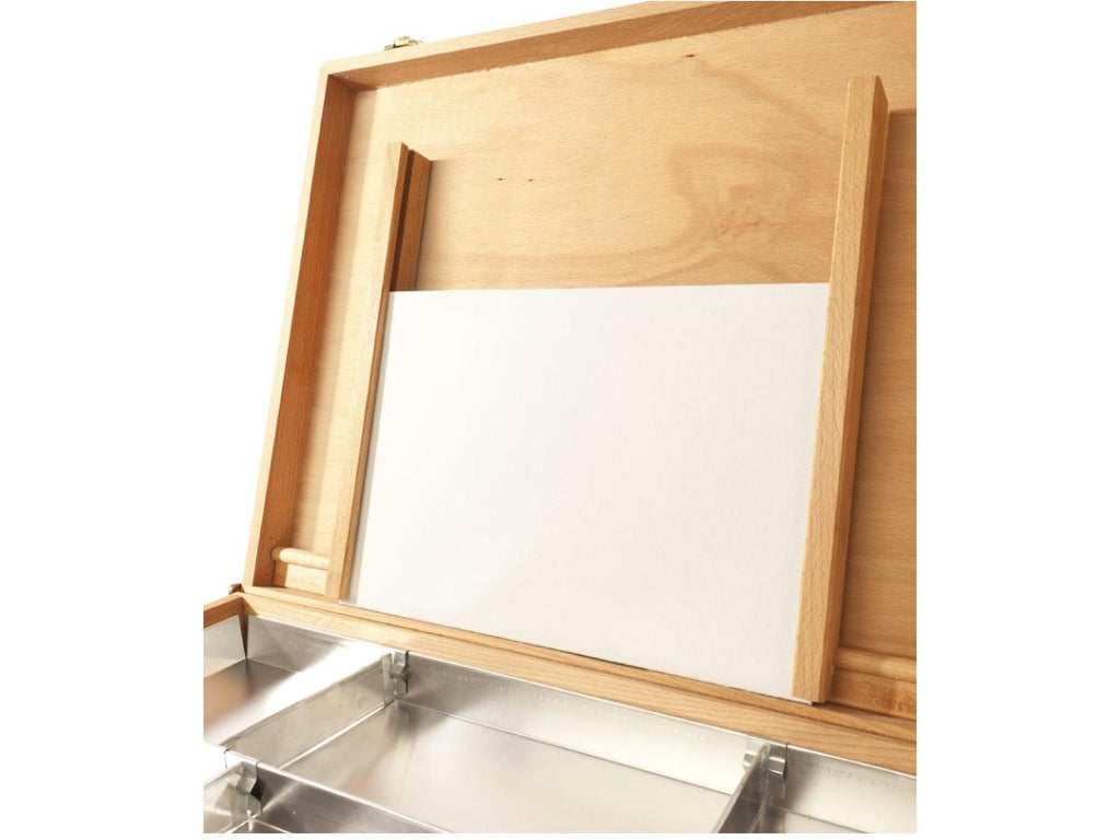 Beukenhouten schilderskist met lederen handgreep: ideaal voor het opbergen van materiaal.