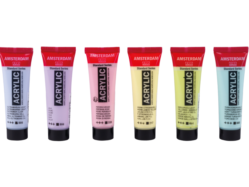 De Amsterdam Standard Series Acrylverfset bevat 6 tubes van 20 ml in prachtige pasteltinten voor zachte en verfijnde kunstwerken. Maar ook voor het aanbrengen van highlights.