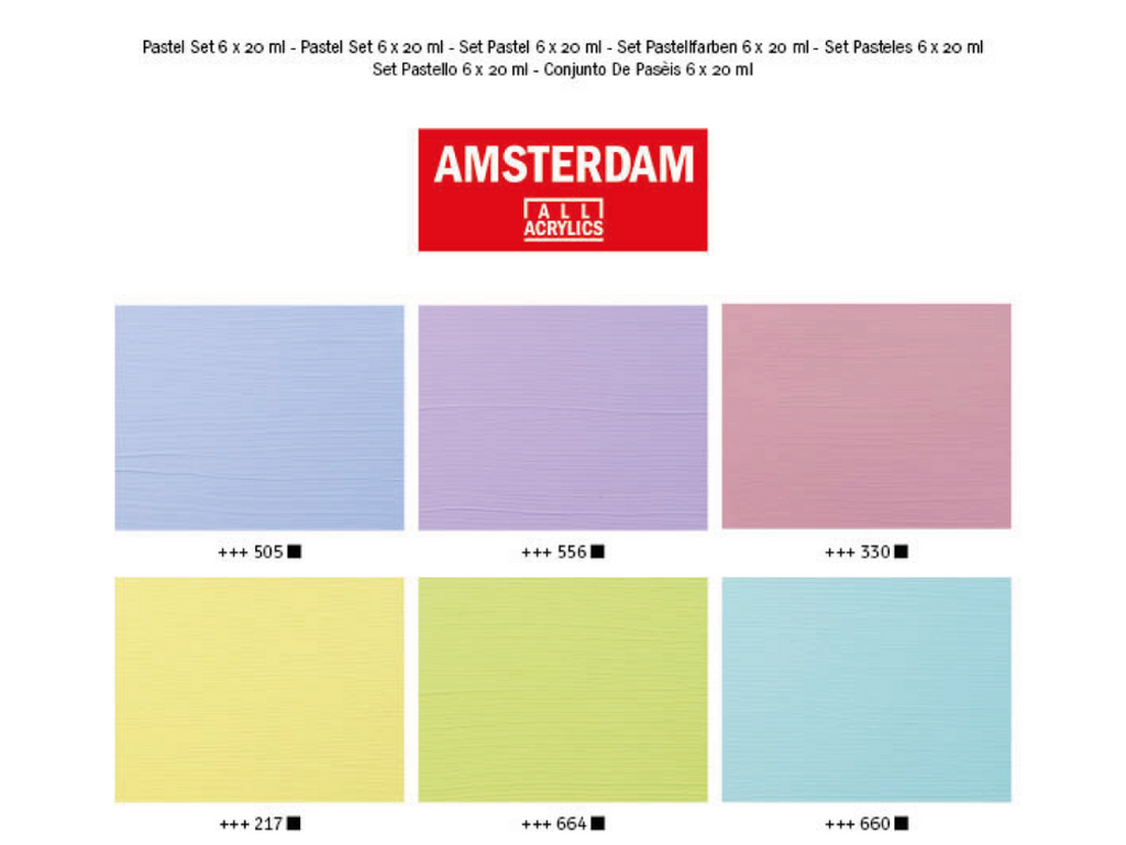 Amsterdam behoort tot ons meest populaire acrylverf wegens een onverslaanbare prijs/kwaliteitverhouding. Ze komen onder andere in handige sets. Deze set heeft een selectie met zes mooie pasteltinten. De tubes, 20 ml, zijn klein en dus ideaal voor kleine details (zoals highlights) of om eenvoudig mee te nemen.