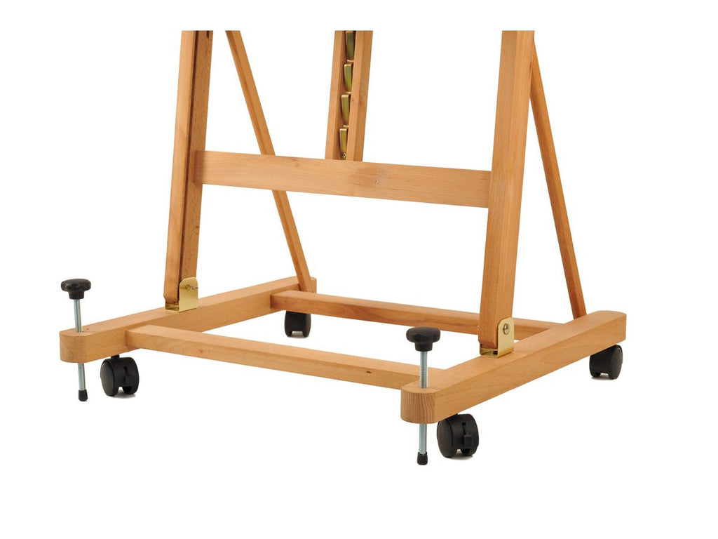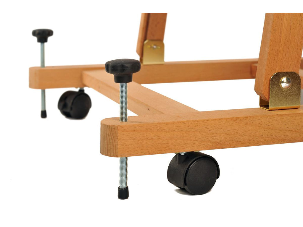 Stevige houten atelierezel. Doordat de ezel wielen bevat, is hij makkelijk te verplaatsen binnen je atelier. De voorste wielen kunnen vastgezet worden, waardoor je tijdens het schilderen niet merkt dat de ezel verrijdbaar is en toch een stabiele ondergrond hebt. De ezel is gemaakt van blank beukenhout van goede kwaliteit.