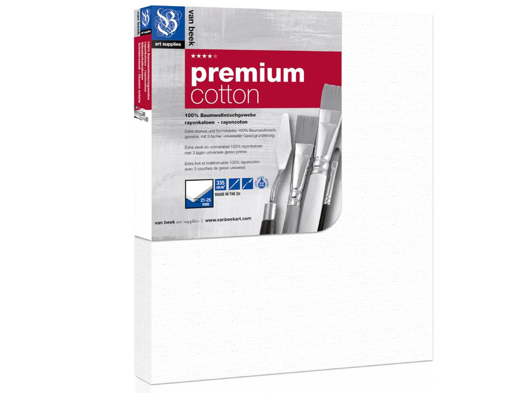 Van Beek Premium katoenen doeken zijn geniet aan de achterkant waardoor de zijkanten (20mm breed) vrij te beschilderen zijn en ze zonder lijst gepresenteerd kunnen worden.Van Beek Premium katoenen Xtra doeken zijn geniet aan de achterkant van de extra dikke spielat (ook wel 3D-lat genoemd) waardoor de zijkanten (40mm breed) vrij te beschilderen zijn en ze makkelijk zonder lijst gepresenteerd kunnen worden. Van Beek Premium doeken en Van Beek premium Xtra doeken zijn stevige doeken die universeel geprimed zijn (2 lijmlagen en 2 lagen primer), het schildersdoek is van 100% eerste kwaliteit (300g/m2 en 21/21 threads/cm2) katoen!