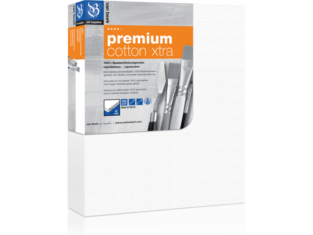 Van Beek Premium katoenen Xtra doeken zijn geniet aan de achterkant van de extra dikke spielat (ook wel 3D-lat genoemd) waardoor de zijkanten (40mm breed) vrij te beschilderen zijn en ze makkelijk zonder lijst gepresenteerd kunnen worden. Van Beek Premium doeken en Van Beek premium Xtra doeken zijn stevige doeken die universeel geprimed zijn (2 lijmlagen en 2 lagen primer), het schildersdoek is van 100% eerste kwaliteit (300g/m2 en 21/21 threads/cm2) katoen!